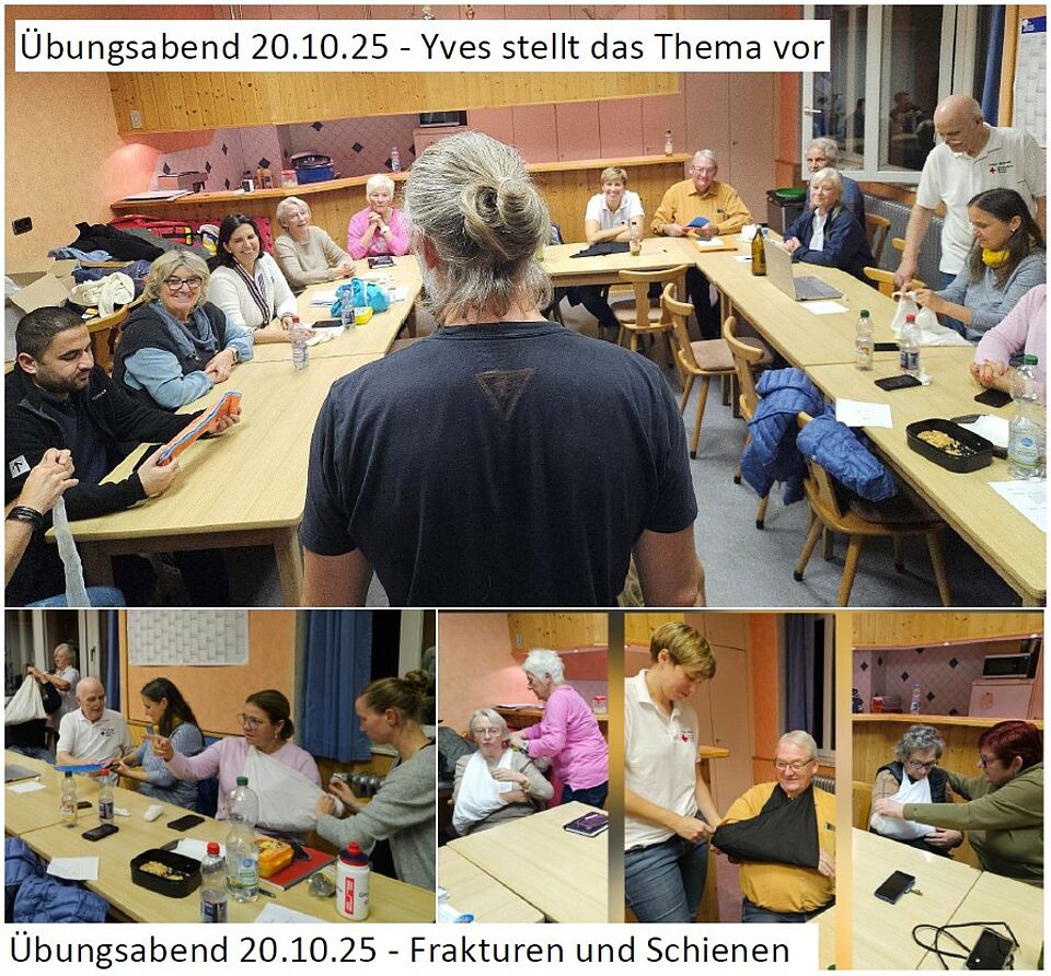 Zu unserem Fortbildungsthema bereitete unser Mitglied Yves praktische und theoretische Inhalte vor, und wir übten aneinander und miteinander das Dreieckstuch zu verwenden und das SAM-Splint anzulegen. Auch Teddybär Lieselotte wurde versorgt und wir hatten sichtlich Spaß. Die zufälligen Paarungen regten zu Gesprächen an und Erfahrungen und Ideen wurden ausgetauscht. Danke an Yves für die Vorbereitung und an die Teilnehmenden für die Mitarbeit. Der Verein lebt von der aktiven Beteiligung an den Fortbildungsabenden und wieder zeigte sich, dass wir viel voneinander lernen können.